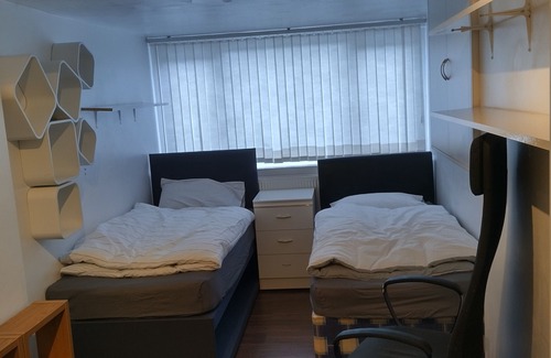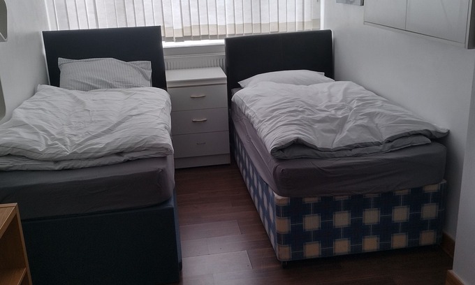 Good sized room with two single beds and a view to the back garden. Plenty of storage room for clothing and suitcases and a writing desk with chair.