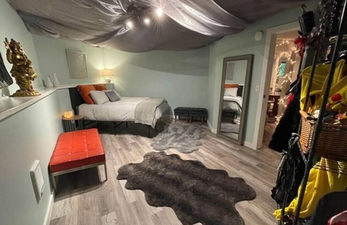 Costume room inside of a Geodesic Dome home. This is a private room connected to a community lounge, kitchen, and bathroom. The property is on 40 acres of nature space that is open to exploration. We have a community 7ft cedar hottub that is available to all our guests. There is also a 1,400sqft gym/martial arts/movement area inside the garage for use.