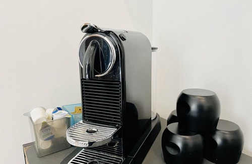Master bedroom with super king size Tempur mattress and ensuite. Amenities include Nespresso coffee machine, Tree of Light lamp with bluetooth speaker and wireless phone charger, television and hair dryer.