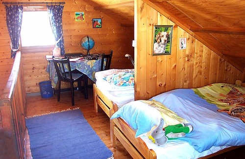 2-room chalet 51 m2, on the upper ground floor. Living/dining room 20 m2 with 1 double sofabed, digital TV, video and hi-fi system. Exit to the terrace. 1 room with 1 french bed. Kitchenette (4 hot plates, oven, dishwasher, microwave, freezer, electric coffee machine). Bath/WC. Electric heating. Upper floor: (steep stair) gallery with sloping ceilings, ceiling height 100 - 200 cm with 2 beds. Terrace 20 m2. Terrace furniture. Facilities: washing machine. Please note: (extra). Maximum 1 pet/ dog allowed. Smoke alarm. Instead of an enclosed bedroom, some sleeping areas are located in an open-plan area (gallery, alcove, etc.).