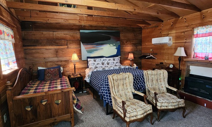 German Haus is a private rustic studio cabin with Queen bed, a twin bed, a kitchenette, 2 seating high back chairs, kitchen table, and shower bathroom. It's great for the outdoor type person. Equipped with local TV channels, DVD, MW, WIFI, coffee pot, tea pot, kitchen utensils, fridge, and eating table. DOGS ALLOWED @ $25 NIGHT PER DOG. WE DO NOT ACCEPT CHECKIN AFTER 10PM UNLESS SELF CHECKIN ARRANGEMENTS HAVE BEEN MADE. THE INTERIOR IS OLD BARN WOOD & TONGUE AND GROOVE PANELING. CABIN IS AS THE PHOTOS SHOW.