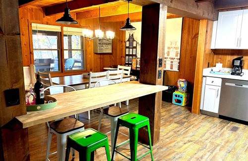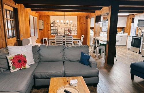 This exceptional cabin features a spacious open layout that seamlessly connects the kitchen, living room, and dining area, creating the perfect atmosphere for celebrations. The fully remodeled kitchen boasts quartz countertops and stainless steel appliances, ideal for crafting delicious meals during your stay. Enjoy evenings around the impressive gas fireplace or gather outside by the firepit, where laughter and stories can be shared under the stars. With amenities such as an arcade, fast Wi-Fi, and pet-friendly accommodation, you can ensure a fun and relaxing experience for all your loved ones. You will also find convenient facilities like a pack n' play and highchair, catering to your family needs during the celebration.