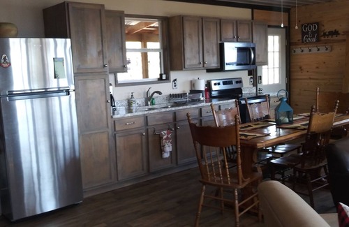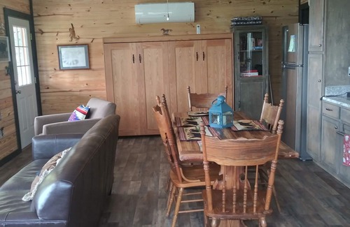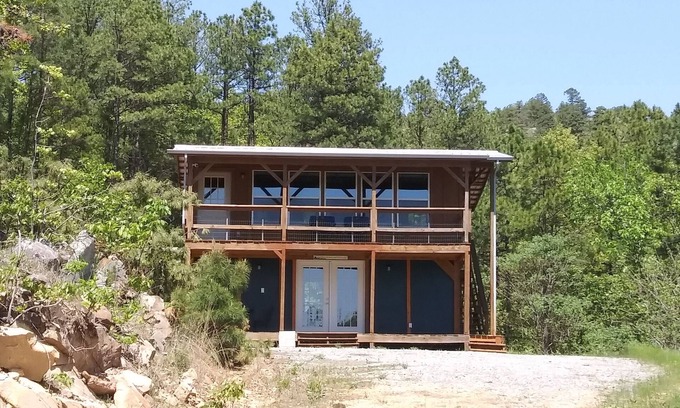 Kick back and let your worries disappear at the Whispering Pines Cabin. Behind a locked gate, our secluded cabin is best accessed with a Four-wheel Drive vehicle or at least a vehicle with higher clearance. Our cabin is Located on a 5.5 wooded acre tract with pines, hardwoods, creek, and amazing rock formations. Take advantage of hikes down to the creek for playing and enjoying birding and sounds of nature. The Whispering Pines Cabin is two separate levels. The 2nd floor is the main level with outside staircase to enter the open concept kitchen, living, and sleeping area with queen Murphy Bed. A full bath with shower is also on this main level. Large front and back covered decks are also on this 2nd level to enjoy the incredible views of the Potato Hills, Kiamichi Mountains, and Sardis Lake. The bottom level is a totally separate space that we have made into a private bedroom with comfortable king bed and leather loveseat, full bathroom with shower, and utility room with washer/dryer. This space also has a 60 inch TV with Roku for streaming, and DVD/Blue Ray player with an assortment of movies for a modern distraction, or if inclement weather keeps you indoors. The first level also has a large covered deck. Our three decks enable guests to enjoy the incredible views after you have enjoyed a day hiking to the creek on our property, fishing or playing at Sardis Lake, or taking in the wonders of nearby Talimena Scenic Byway with Winding Stair Mountain or Robbers Cave State Park. Or just kick back and watch for the Eagles flying above the lake or listening to the sounds of nature while drinking a hot cup of coffee and watching the incredible sunrise or amazing stars and night sounds. We have all you need to relax and unwind with a fully stocked kitchen complete with dishware, cooking utensils and seasonings. We also keep an assortment of books and games. Our rainwater collection and six stage UV treatment system offers incredibly good tasting and safe drinking and cooking water. No need to bring any bottled water here! We also have Starlink high speed internet so you will never miss phone communication since cell service is spotty in this area. If you have an emergency, need to check into the office, work from the cabin, or take a call for work, we've got you covered. Our cabin is great for a single person, one couple, two couples, or a family. For safety, we do not allow children under age 8. We have rugged terrain all around the cabin and property, and tall decks and stairs that are unsafe for younger children. For security, we have two outdoor security cameras. One at the front facing the driveway, and one at the back facing the back upstairs main door. Please send an inquiry if you have any questions. We will be happy to share our little bit of heaven with you.