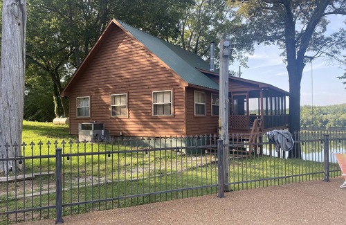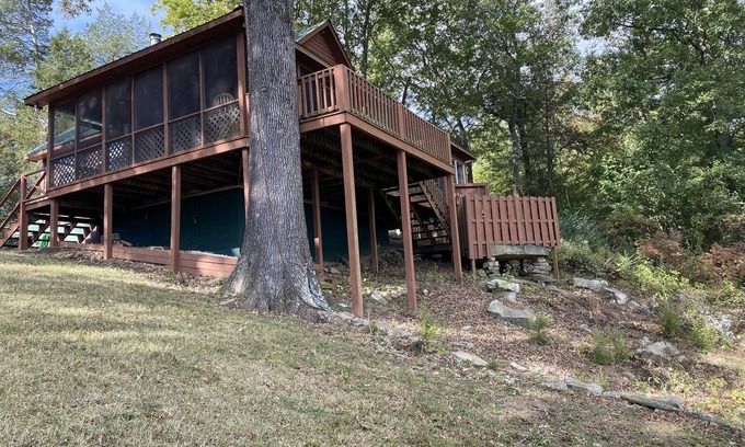 This cabin is the first cabin as you drive up the long gravel driveway. Three cabins sit on 7-1/2 acres of the Ozarks here. With the best view of the river and the pool, this cabin has a screened in porch and an unscreened porch that sits over the river ridge. Watch eagles, beavers, and all kinds of wildlife. The cabin is perfect for short or extended visits to all this area has to offer. What sets this property apart is you can gather a group of friends or family together and rent all three and have your own private rest spot but still meet together at all the common areas: swimming pool overlooking the river, 2-acre lake that waterfalls into the river, huge outdoor fireplace, pavilion, gazebo, The Outhouse Lounge with a pool table, pinball, and other games plus acres to explore. The cabins are spaced out enough for each one to have their own privacy and their own comforts. Enjoy the vibe this secluded area has-if you love outdoors and beautiful scenery-you came to the right place. If exploring Arkansas is on your schedule this property is 20 miles from Mountain View or Batesville. And the drive here is spectacular. Worried about the seclusion? There is a property manager onsite that lives in the main house that sits a distance from the rentals for any issues you may have.