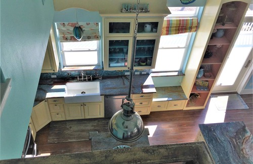Stunning, elegantly appointed, custom waterfront home with views of the bay AND the beach. No detail overlooked in the design of this beautiful space: from its soaring ceilings, artist-commissioned furnishings and chandeliers, to the hand-painted wood floors and gorgeous Louis Blue granite throughout, you will love its exquisite, shabby-chic beachy charm. Three surrounding decks (one of them screened in!) plus a rooftop terrace offer amazing views in all directions. Exquisite design & amenities: the perfect blend of luxury, comfort and entertainment for your get-away!