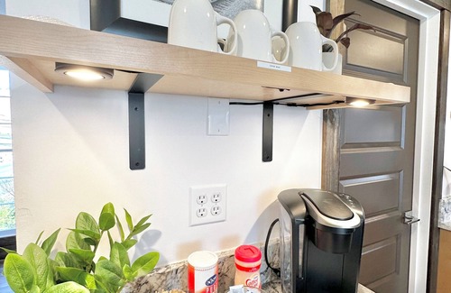 Really a funky cool studio! The house is an 1870 Victorian and this unit has private entrance located over the three car garages. Kitchenette has fridge/freezer, Keurig, microwave, toaster, two-burner stove, pots, pans, utensils, china, cutlery and glassware. It is not a full kitchen.