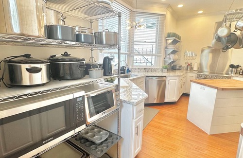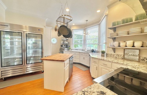 As you step inside, you'll be greeted with breathtaking views of the lake and lawns through the giant windows, you’ll even see how the sunset pours colors into the house at "golden hour". Gather in the cozy living room, where you can enjoy the smart TV with satellite/cable channels. The fully stocked commercial kitchen, complete with a stove, oven, refrigerator, and all the necessary appliances, invites you to unleash your culinary skills and savor delicious meals. We even offer a high chair for the little ones!