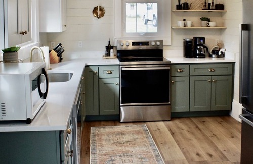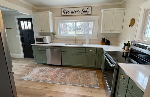 Upon walking in the back door just off the driveway, you will be welcomed into a warm entry way where our guest booklet is located. We hope that this booklet will help to answer any further questions you may have during your stay! Once inside, guests will find the original tongue-and-groove in multiple rooms, as well as many of the larger baseboards, doors, and antique knobs! To the right is your laundry room and to the left is an all-new kitchen for all of your cooking needs, including a coffee bar that's perfect for any coffee lover!