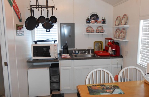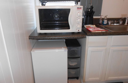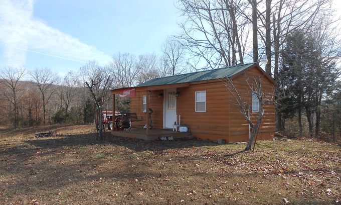 This quaint efficiency cabin sits on 45 acres. Sleeps four people. There is a queen bed and day bed with trundle. This getaway has everything you need and more: one bathroom, microwave, convection oven, small refrigerator, hot plate, kitchen sink, table and chairs, satellite television, small gas grill, fireplace heater, air condition window unit and satellite television with Blu-ray player. Linens, towels, cookware and tableware provided. The property is beautiful with rolling hills and access to Cane Creek.