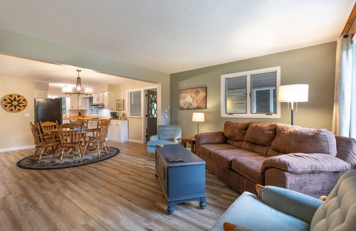 Inside, the cabin offers an open layout with plenty of room to spread out. The large dining room table is perfect for family meals, and the newly renovated kitchen is fully stocked with everything you need for cooking and dining. The kitchen includes a microwave, drip coffee maker and Keurig, full-size fridge, dishwasher, spices, oils, and even an air fryer.
