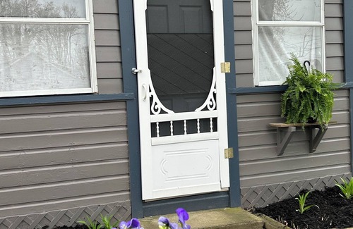 Definitely a charmer with seating outside and a path to the door. We have a newly re-done pool available for our guests, a fire pit, and green space (all shared with the other cottages at Tiffany's Cottages).