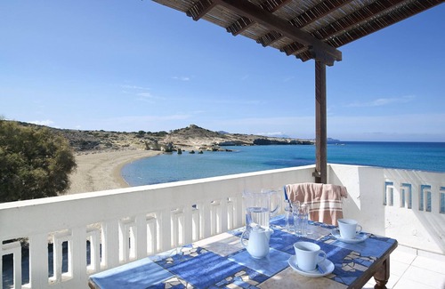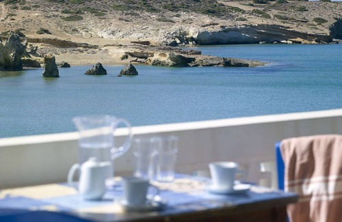 Gialos house is unique among properties in Milos because of its location. Literally just a few meters from Pachena's sandy beach, it only takes moments from where you'll be staying to walk down to the water and back. This also means a beautiful unobstructed view from the apartment's balcony as well as the two bedrooms. Perfect for families of up to four, Gialos house is cleaned daily and linen and towels are changed every two days.