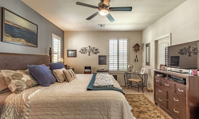 No matter what your reason for visiting AZ, whether it be the warm weather, golf, Spring Training, work, or just to get away, we offer a private, quiet space in our bungalow home. Enjoy a soak in our patio hot tub, walk to the nearby pool, go for a stroll on any of the miles of trails, or just relax in your cozy King bed and watch any of our hundreds of movies or shows from our collection. Great shopping nearby at Santan Village or visit the quaint downtown area of Gilbert.