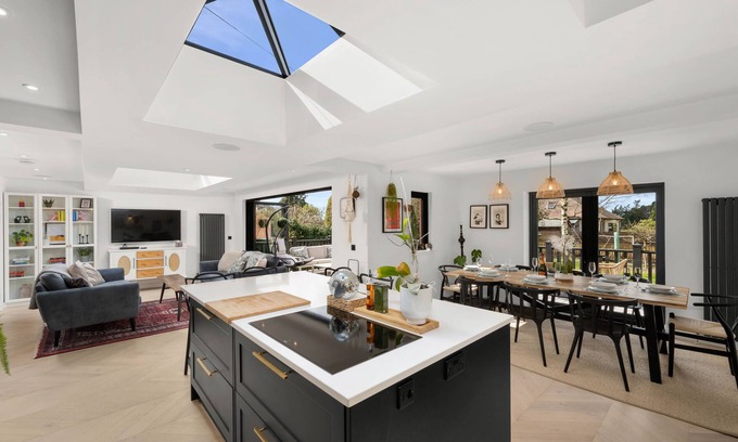 Bright, modern kitchen/dining/family room with bifold doors to the deck area