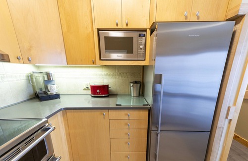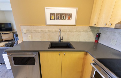 -Newer high end appliances including full size fridge/freezer, oven, dishwasher, garburator, microwave, coffeemaker, kettle etc. in a fully equipped kitchen. Lots of mugs, glasses, cutlery, plates, pots and pans.