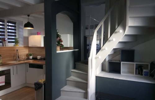 Ground floor, living room with fitted kitchen area (induction hob, dishwasher, washing machine, oven, microwave, coffee maker ...), dining area.