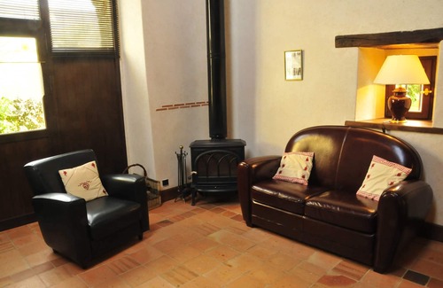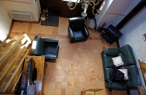 On the ground floor: a room (bed 2 mX 1. 6 m) with shower and toilet kitchen with gas and ___la élect- plates microwave-dishwasher - fridge - robot - kettle - coffee _____ dining room - lounge leather sofa - wood stove - TV and DVD player.