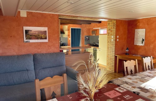 At the start of numerous hiking trails and the brand-new “voie verte” to the Grand Ballon, traditional 4-bedroom house (one through) ideal for 8, max. 12 people. Fully-equipped open kitchen (oven, 4-burner gas stove, fridge, 12-top dishwasher), 2 living rooms with games and reading area, widescreen TV, broadband fiber, free WiFi, 2 bathrooms with shower, separate toilet, laundry room with washing machine, free bike storage.