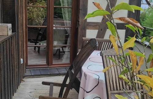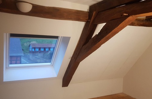 GITE FOR 4 PEOPLE ON THE 1st FLOOR AND ROOF SPACES OF AN ALSACIAN HOUSE WITH APPARENT HALF-TIMBERED-FIREPLACE-LIBRARY-LIVING ROOM. MODERN EQUIPPED KITCHEN OPEN TO LIVING ROOM DINING ROOM. BATHROOM WITH SEPARATE CORNER BATHTUB. 2 LARGE BEDROOMS UNDER THE ROOF WITH MEZZANINE CORNER TELEVISION AND IF DIFFICULTY OF ACCESS, STAIRCASE MEUNIER POSSIBILITY OF ANOTHER BEDROOM ON REQUEST. SMALL TERRACE WITH DIRECT ACCESS TO DINING ROOM + LARGE TERRACE NEAR BASIN