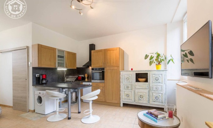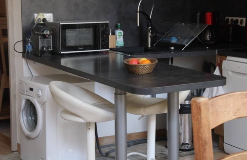 Studio on the ground floor of the house owners also hosting 2 guest rooms. Fitted kitchen open to living room (1 bed 140x190cm + 1 sofa bed). Shower room (large shower) with WC. Washing machine + dishwasher. Private terrace. Parking on site and garage for motorcycles / bicycles. Linen included + beds made. Towels provided. Wifi internet connection. Old school with a large garden with terrace and barbecue in the heart of the village. Magnificent stone house in a preserved environment in the quiet and near the shops, services and public transport.