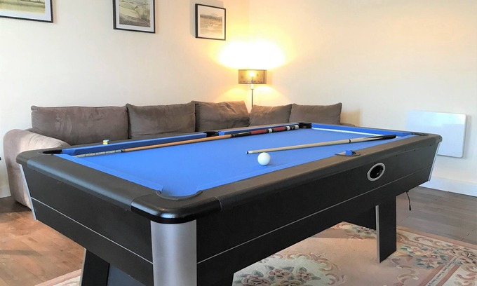 The large sitting and dining room has a flat screen TV with both British & French satellite channels. There is a separate games room with pool table, table football and darts. The kitchen is fully-equipped with a breakfast bar, electric oven, fridge/freezer and dishwasher.