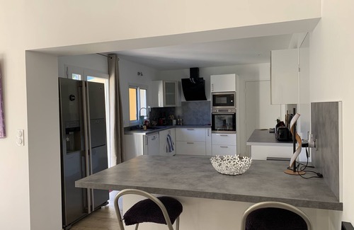 The self-contained ground-floor gîte, heated or cooled by reversible air-conditioning and a pellet stove, has three bedrooms, each with en-suite shower room and toilet, and a large living room with integrated kitchen, fully equipped with washing machine, dishwasher, induction hob, oven, microwave, American fridge/freezer, corner sofa convertible into a 2-seater bed, connected TV, free Wi-Fi connection, piano, games table, towels, bed linen, toiletries, laundry, cleaning and seasoning supplies. You can also take advantage of a private terrace and garden, equipped with a table for 8 people, relax chairs, garden furniture, plancha barbecue... For each room, you can request a double or twin layout, i.e. 1 king-size double bed or 2 single beds.