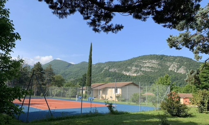 We are delighted to welcome you to Domaine Prashanti, located in Saint-Just de Claix, just a 5-minute walk from the center of the village of Saint Nazaire en Royans and all its amenities. It benefits from a prime location, both quiet and close to numerous activities, at the foot of the Vercors and at the gateway to Royans, offering a breathtaking view of the mountains. This haven of peace is set in 1.2 hectares of wooded, fenced and secure grounds, including a private tennis court and parking area, available free of charge.