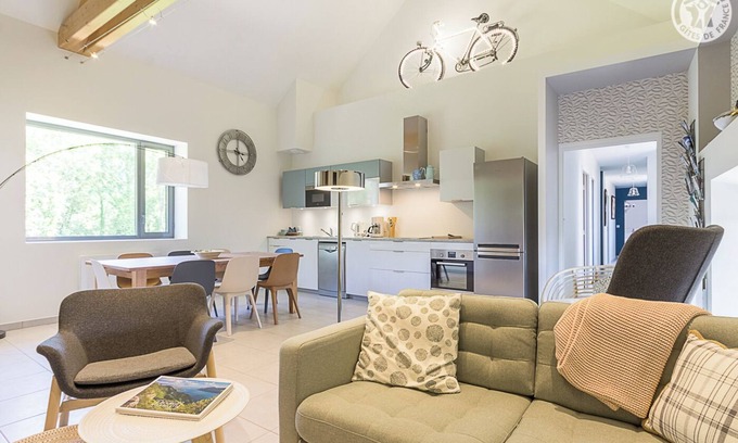 Gîte on the 1st floor of the old cure of the village. Access by outside staircase. Public parking near the house. Bicycle garage / secure cellar. Large living room (living room-kitchen) with cathedral ceiling. 1 walk-in closet. 4 bedrooms (1 bedroom with 1 double bed / 2 bedrooms with 2 twin beds 90x200cm / 1 bedroom with 4 single bunk beds). 2 bathrooms (shower) with double washbasin cabinet and electric towel rail. 2 separate toilets. Sheets included and beds made on arrival. Bathroom linen provided. Wifi internet connection. Washing machine + dryer. Old cure of the village transformed to accommodate on the ground floor the library of the village and on the floor a lodging comfortably fitted out for 10 people. Functional layout and neat decoration delicately combining vintage pieces with furniture with contemporary lines. Pleasant light in the living room with exposed beams. Gîte benefiting from the Accueil Cyclos qualification (storage and cleaning space suitable for cyclists) and Gîte Pêche (possibility of fishing nearby, provision of a fridge, etc.).
