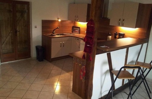 - Living room with open kitchen (60m²) fully equipped, wood stove,