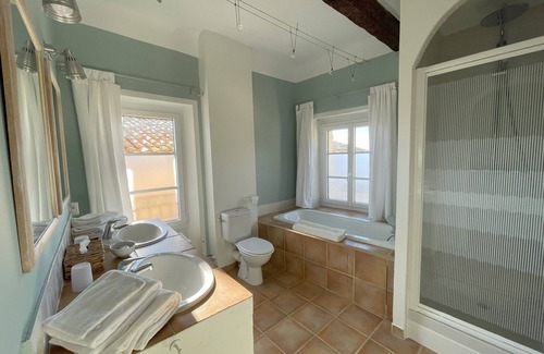 - a large bathroom with a bathtub, separate shower, double sinks, and toilet.