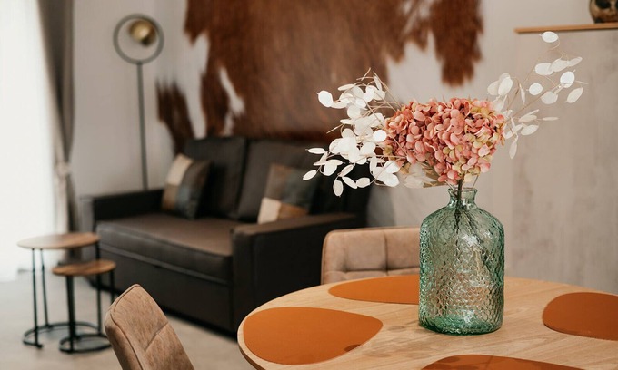 The living room wall features wallpaper imitating cowhide, and a cowbell adorns the space to add a touch of authenticity to the living room. The final touch: the stove creates a cosy atmosphere.