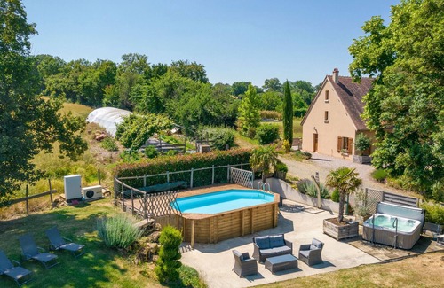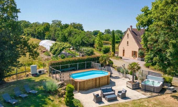 In Berry, you like peace, history, nature, hiking. You will be here at home. 10 minutes from La Châtre, 15 minutes from Nohant, home of George Sand. Above-ground swimming pool open from April to October depending on the weather and it is also heated if necessary (6.40 x 4 meters). A 5-person Spa accessible only to adults (from 18 years old, open all year round) shared with another gîte. Hunting and fishing possible on site. 15 minutes from mechanical sports and 30 minutes from water sports. Large flowered semi-detached gite rebuilt using old and eco-sustainable materials. Ground floor: entrance - laundry room - individual toilets - living room (stove) / dining room / equipped kitchen. 1st floor: Lavande bedroom with a 160 cm bed - Solanum bedroom with a 140 cm bed - lounge area with library - bathroom (walk-in shower) - individual toilets. 2nd floor: mezzanine (2 single beds) and fitness area. Heating by heat pump and wood stove (included in the price). Unenclosed private garden and terraces (garden furniture, games). Bicycles available. Fishing at 50 meters. Outdoor games: pétanque court, ping-pong table, sandpit, small football pitch. Sheets are offered for stays of 7 nights or more Valentine's Day offer: a free local gastronomy box. For weekend arrivals (Friday) reception is from 3 [hidden] to 8 [hidden] Departure on Sunday can be at 2 [hidden] (to be specified) For summer vacation arrivals, reception is from 5 [hidden] to 8 [hidden] and departure at 10 [hidden] Optional services to be paid on site and to be reserved before your arrival: - Towels: 7.45€ per person per stay - End of stay cleaning: .00€ per stay Unless stated, services such as cleaning, bed linen, towels etc. are not included in the price of this rental. If pets are allowed (information in the advertisement), charges may be applicable. Only equipment mentioned in this advertisement are present. Equipment not mentioned are not considered to be present.
