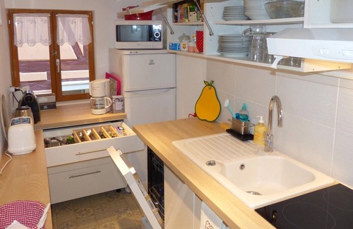 The semi-open kitchen, equipped, among other things, with a dishwasher and a Nespresso coffee maker as well as a filter coffee maker. At your disposal, basic products: salt, sugar, oil, vinegar, tea, coffee, spices. Also on site, all cleaning products as well as vacuum cleaners, mop.