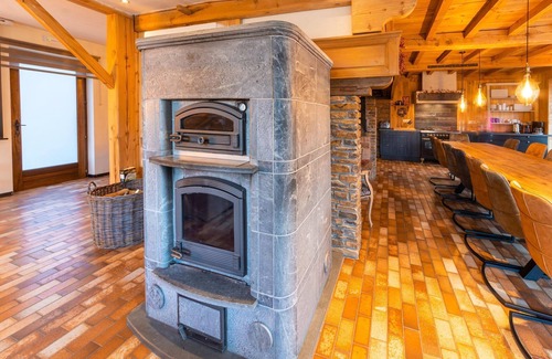 Layout: Ground floor: (Sitting room(TV, stove(wood), seating area), dining room(dining table), Kitchen(electric kettle, toaster, cooker, espresso machine, oven, oven, microwave, dishwasher, dishwasher, fridge, freezer, Juicer, Blender, Food processor), toilet, relaxation area(seating area, party games), bar) mezzanine: (bathroom(tumble dryer, shower, washbasin, toilet, washing machine)) On the 1st floor: (bedroom(double bed, TV), bedroom(single bed, double bed, TV, balcony or terrace), bedroom(double bed, TV), bedroom(double bed, TV), bathroom(shower, washbasin, toilet, hairdryer), bathroom(bath tub, washbasin, washbasin, hairdryer)) cot, air conditioning, garden, garden furniture, BBQ, parking, lounge set