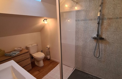 Upstairs, 2 bedrooms with double beds (140 cm) with private shower room and WC, a bedroom with a 90 cm single bed, a dressing room and wardrobe.
