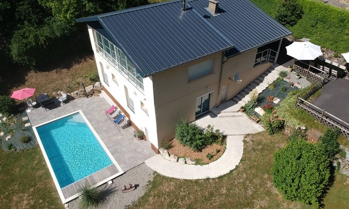 This house has enclosed grounds of 2400 m², a swimming pool, a terrace with garden furniture, deck chairs, gas barbecue and a garage (2 spaces). On the ground floor, large bright living room with stove (free wood), connected flat screen TV, DVD player, internet access, fitted kitchen area with induction cooktop and senseo coffee maker, 1 bedroom with 1 140x200 bed, 1 bedroom with 2 single beds, bathroom, separate toilet and laundry room. On the garden level, 2 bedrooms with 1 140x200 bed, bathroom with toilet, children's area (books and games available). Table linen provided, beds made on arrival. Electric heating included. Prices all charges included. Shops in Laroquebrou 10 km. Animal supplement €30 from the 2nd. Cleaning deposit €100.