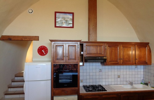 - a large living room with sitting area, sofa bed (convertible) - coffee table - flat screen TV (TNT channels), with dining area (rustic table and chairs) separated from the kitchen by a bar; the kitchen is fully equipped with double sink, gas hob, electric oven, fridge and freezer compartment, dishwasher, microwave, classic filter coffee maker, kettle, toaster and all the necessary dishes.