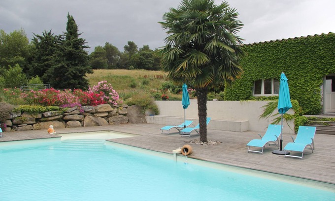old equestrian center located 5 minutes from the medieval city of Carcassonne. Ideal for a romantic getaway or a more relaxing stay, you can discover nearby the lake of cavayere, the GR36, the Canal du Midi and all the villages of the pay cathare . the swimming pool and the park of the domain in the middle of the garigue offer calm to enjoy the pretty sound of the Mediterranean cicadas. private and closed parking is provided on the property with possible garage for motorbikes.