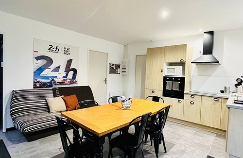 20 minutes from the 24 Hours circuit, 30 minutes from the center of Le Mans, recharge your batteries in our accommodation suitable for families thanks to its 5 beds and large bathroom. Large living room with fully equipped kitchen, table, and flat screen sofa. 1 bedroom with 2 single beds that can be twinned into a double bed and 1 bedroom with 3 single beds. Large bathroom with sink, large shower and toilet.