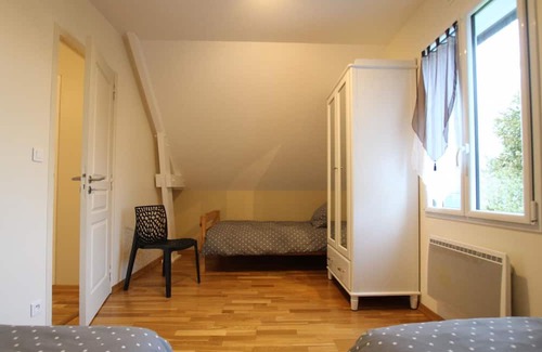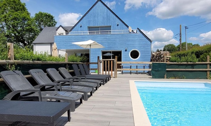 Contemporary house with private heated swimming pool. Living room, equipped kitchen (cooking range, dishwasher, freezer, microwave, Nespresso, plancha, 2 raclette machines). Dining area with wood stove. Bedroom 1 (1 bed 160X200). Bedroom 2 (2 90X190 beds and 1 80x190 bed). S. water. WC. Balneotherapy area: sauna, outdoor jacuzzi (accessible all year round). On the 1st floor, living room, relaxation area (TV, blue ray DVD, WiFi Internet, billiards, table football) opening onto a balcony terrace (12m²). Laundry room (laundry, tumble dryer). Wc. S. water. Bedroom 3 (1 bed 160X200). Bedroom 4 (1 bed 160X200 and 1 bed 90X190). Upstairs above the spa area, bedroom 5 (2 90x190 beds, 1 140x200 bed), wc, shower room and mezzanine bedroom (1 90x190 bed). Baby equipment. Sheets and towels for rent. Additional cleaning service. Electric heating included. Private enclosed garden. 1 large terrace. Garden room. Private swimming pool heated from May to September (8X4m). Barbecue. Ping-pong. Lockable bike room. Car park. With a beautiful green space, La Maison Bleue is built in the heart of the bay of Mont St-Michel, a few minutes from Avranches. This large contemporary house is spacious and comfortable. In addition to its 5 bedrooms + 1 mezzanine bedroom (sleeps 15), it offers spacious living rooms. Everything is thought of for the relaxation and well-being of your little tribe: from the large living room with games upstairs, to the balcony terrace without forgetting the spa equipment (sauna and jacuzzi) and the heated swimming pool just for you!! Ideal for a weekend, this remarkable address will be perfect for 3 families since 3 sleeping spaces are well separated in the house and each benefit from a toilet. The Normandy getaway welcomes you! The price does not include: charging an electric or hybrid vehicle 1 bedroom on the ground floor, TV, Washing machine, Dryer, Dishwasher, Microwave, Freezer, Sheets for rent, Household linen for rent, Baby equipment, Enclosed grounds, Internet access, Well-being, Living room. garden, Barbecue, Swimming pool, Parking, Terrace, Garden, Pets allowed, Individual house, optional cleaning service. Option to be paid on site: End-of-stay cleaning package: €150. Bathroom and household linen (tea towels). : €8. Bed linen rental for 1 person: €12. Bed linen rental for 2 people: €18. Property managed by a professional. Unless stated, services such as cleaning, bed linen, towels etc. are not included in the price of this rental. If pets are allowed (information in the advertisement), charges may be applicable. Only equipment mentioned in this advertisement are present. Equipment not mentioned are not considered to be present.