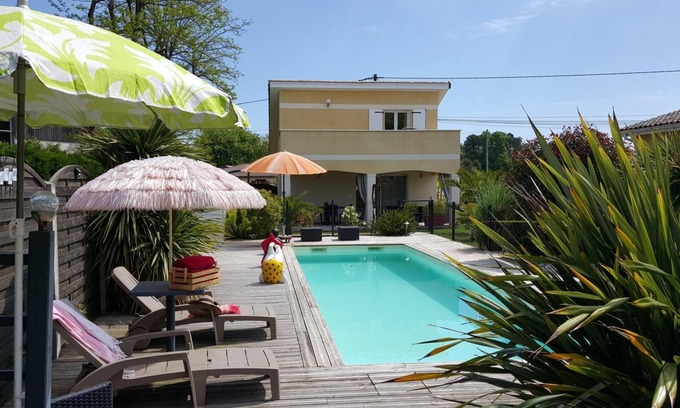 Your dream is to find yourself in a welcoming, cozy, family-friendly place with a bohemian Zen decor, then come to "Mimi yuu". Caroline and Fabien welcome you to this lovely, peaceful nest where you can enjoy the heated swimming pool available from June to the end of September, enclosed grounds. Its spa is accessible from 12 p.m. to 6 p.m. and two pretty terraces, one on a higher level, will allow you to laze around, a book in hand and the other to share convivial meals around a barbecue or a plancha. Children between 3 and 9 years old can enjoy a portico. Inside, the living room consists of a lounge area with a home cinema, board games and its dining area with integrated kitchen. A bathroom with walk-in shower / WC included on the ground floor. Laundry area under the stairs with washing machine. Upstairs, a first bedroom beautifully decorated and its bed 140x190, skylight, then a second bedroom with a bed 160x200m opening onto the terrace with sun loungers and high table and stools, view on the vineyard of Corconnac. For winter evenings a pellet stove will warm you (bags extra, and billing of electricity consumption in addition to 8kw / h). Table linen is included, and for stays of 1 and 2 nights, sheets and towels are provided. Swimming pool of 3mx10m with alarm and depth of 1m20 to 1m90, open depending on the weather. In the heart of the most famous vineyards in the world, these expanses of pine forests and very close to the Atlantic Ocean with its beaches and natural lakes. You can sail, play, taste oysters on our magnificent Bassin d'Arcachon after climbing the Dune of Pilat. Visit Bordeaux, 44 km away, a UNESCO World Heritage Site. Its historic center, museums, Europe's longest shopping street, and restaurants will make your head spin. The property also features a dog, three cats, chickens, and a rooster. Private rentals are available.