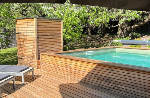 At the gates of Montauban, love at first sight that the owners invite you to share for this typical property, proud of its red bricks and its oak wood. Resolutely contemporary, this new cottage looks great with its wooden siding, modern lines, square swimming pool, and its charming asset with a completely private wooded exterior. Not overlooked, enjoy the serenity that reigns here, the trendy decoration and the pleasure of sunbathing at any time. To discover! Housing on one level after three wide external steps, independent entrance. It includes: 1 living room with kitchen area (integrated elements, fridge-freezer, oven, hotplates, dishwasher) and living room (sofa, pouf, TV, wood stove), 1 cellar (washing machine, dryer), 1 bedroom (1 160/190 bed) with connecting bathroom (2 sinks, 1 walk-in shower), 1 separate toilet. wifi in the accommodation, household, bed and bathroom linen provided, bathrobes provided. Private wooden terrace (80m2) where the private square pool is located (4m x 4m, 1.2m deep). Terrace in front of the living room with garden furniture, barbecue. Private parking. 2 hybrid bikes on site. Electric heating. Optional services to be paid on site and to be reserved before your arrival: - End of stay cleaning: 47.87€ per stay Unless stated, services such as cleaning, bed linen, towels etc. are not included in the price of this rental. If pets are allowed (information in the advertisement), charges may be applicable. Only equipment mentioned in this advertisement are present. Equipment not mentioned are not considered to be present.