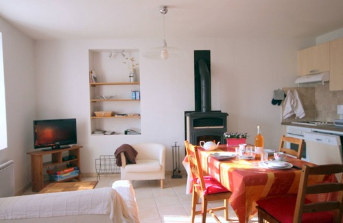 Ground floor: entrance to living room/open kitchen equipped (multi-function oven, microwave, fridge-freezer, dishwasher), wood stove (first fire offered, for the following fires, the wood is not provided by the owners), sofa, 70cm TV. WC.
