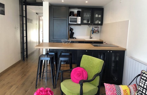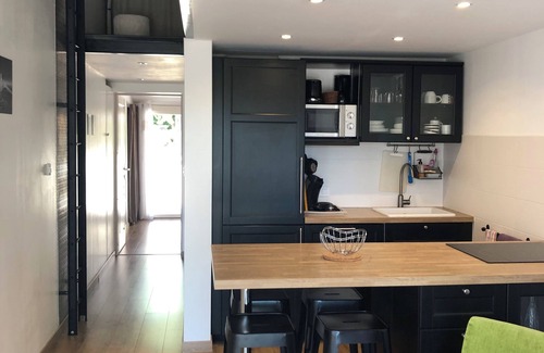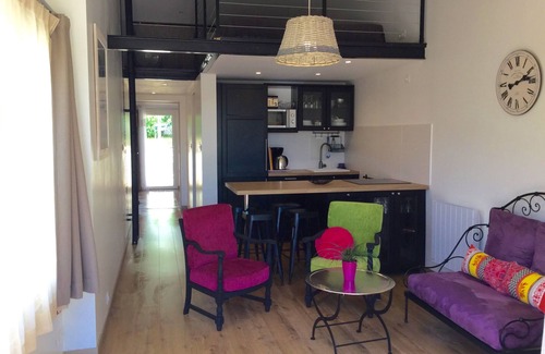 The cottage NEAR JASMIN offers a beautiful area of 50 m2 in a chic and warm style. It consists of a living room with integrated fully equipped kitchen, a large bedroom with TV, a mezzanine of 15m2 that can serve as second bedroom and a bathroom.