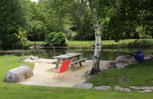detached house, recently renovated, located on the southern slope of the mountain of locronan. landscaped and secure setting, designed to provide you with a natural and relaxing environment. the accommodation offers you a sober and modern interior layout, an equipped kitchen, opening onto a south-facing terrace, as well as one on the edge of the water, for spending good times with friends or family, around a barbecue.