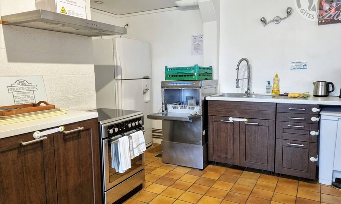 On the ground floor: Equipped kitchen (microwave, oven, dishwasher) open to a large living room of m² (possibility of organizing meetings, rental of the room on site), 1 bedroom accessible to people with reduced mobility (1 bed 160 * 200) with open and private bathroom (1 sink, 1 shower). 3 shared toilets. Upstairs, a bathroom with 2 shower cubicles, 1 sink. 2 adjoining bedrooms: 1st bedroom with 2 beds 90 * 190 and 1 * 2 bunk beds, 1 sink and, 2nd bedroom with 1 * 2 bunk beds and 1 bed 90 * 190 and a sink. Then, 2 other adjoining bedrooms: the 1st with 2 bunk beds and 1 single bed, sink and, the 2nd with 1 * 2 bunk beds and storage. The high sleeping area is not suitable for children under six years old.