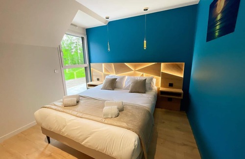 All-inclusive gîte (except tourist tax) with private, heated indoor swimming pool (7x3.5m) (secure access door) and 3/4-seater sauna. [hidden] : living room (2 connected TVs, billiards area) open to the kitchen (3-burner induction hob, wine cellar, Krups grain coffee maker and filter coffee maker), 1 bedroom for disabled people (1 bed 160x200, bathroom with toilet), wellness area accessible via the living room (indoor swimming pool, 3/4-seater sauna, toilet), separate toilet. Floor (reversible air conditioning): 1 bedroom (1 bed 90x200, 2 twin 90x200 beds, shower room with toilet), 1 bedroom (1 bed 160x200), 1 bedroom (3 90x200 beds including 2 twinable), 1 bedroom (2 twin 90cm beds, bathroom with toilet), shower room, toilet. Electric heating (included in prices). WIRELESS. Vast landscaped garden with trees of approximately 2500 m² (gas/plancha barbecue). Charging station for 11 KW electric vehicle (additional depending on meter). Sophrology sessions on request (extra charge). Eco-construction house. Non-smoking accommodation. POOL OPEN: all year round. This exceptional contemporary villa brings together all the ingredients to make your stay unforgettable. Its indoor swimming pool and sauna, its American billiards table, its magnificent bar for moments of pure conviviality and the grandiose equipment are magnified by a decoration and an atmosphere where every detail counts. The pleasure of the eyes as well as the general well-being, whether indoors or in the sumptuous garden bordered by the forest, will guarantee you moments of happiness to share with family or friends. If you like to savor these magical moments provided by this unique place, the riches of the Loire Valley which surround you will seduce you just as much: Saché and its castle, home of Balzac, Azay-le-Rideau, its famous castle and that of Islette, lesser known and no less essential, Villandry and its Renaissance gardens compete in beauty. Chenonceau, Amboise, Chambord or Chaumont-sur-Loire are to be discovered, like the Beauval Zoo...
