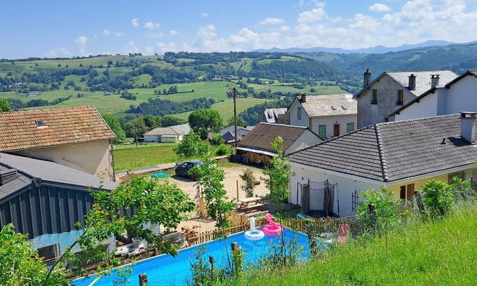 Gite puy Chavaroche met uniek uitzicht offers an open-air bath and free private parking, and is within 13 miles of Cantal Auvergne Stadium and 13 miles of Aurillac Train Station. Among the facilities of this property are a restaurant, full-day security, and luggage storage space, along with free Wifi throughout the property. The pool features a fence and pool views. Offering a terrace with mountain views, this vacation home also features a satellite flat-screen TV, a well-equipped kitchen with a dishwasher, an oven, and a microwave, as well as 1 bathroom with a walk-in shower. There's also a seating area and a fireplace. There is an on-site coffee shop. For guests with children, the vacation home provides an indoor play area and outdoor play equipment. Aurillac Congress Centre is 13 miles from Gite puy Chavaroche met uniek uitzicht, while Pas de Peyrol is 24 miles from the property. Aurillac – Tronquières Airport is 14 miles away.