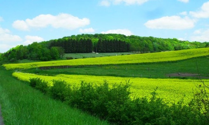 Follow the Les Volets Bleus arrow after crossing the bridge over the River Aire. Head towards the church of Rarécourt.