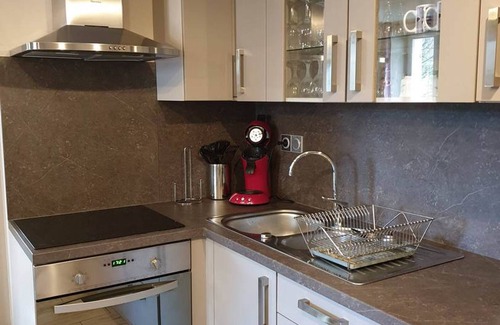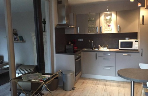 Open-plan equipped kitchen (multi-function oven, microwave, dishwasher, refrigerator with freezer compartment, SENSEO pod coffee machine), wood stove (wood extra, see with the owner), living room with flat screen TV. Shower room (walk-in shower, WC separated by a sliding door).